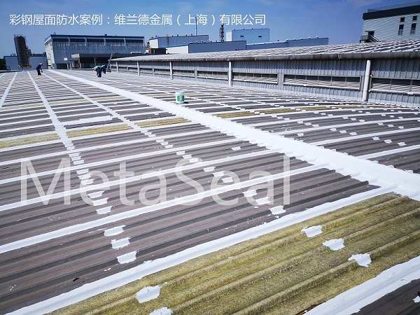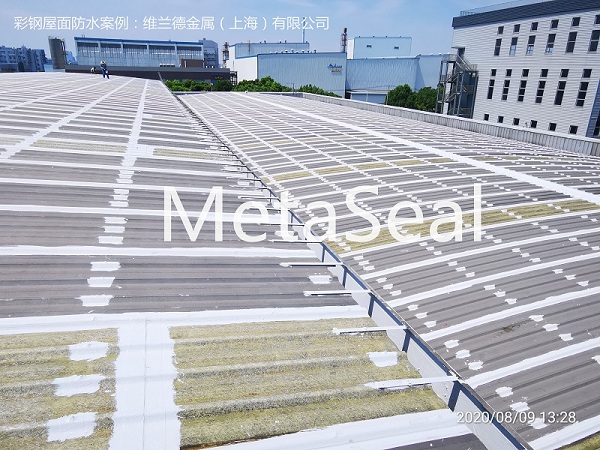 位于上海外高橋保稅區富特中路399號的維蘭德金屬(上海)有限公司,廠房承建至今已有十多年了,確實到了正常維護維修期。2020年5-6月,公司委托上海榮拓實業有限公司,就工業廠房的彩鋼屋面進行系統維護,把之前的三元乙丙卷材清除掉,打磨除銹,所有的搭接縫+釘子,以及6條天溝、泛水等防水薄弱區域,都采用MetaSeal美莎金屬屋面防水體系,進行了系統維護。經過6-7月份連續多次的大暴雨檢驗,防水效果明顯。通過這次維護,也讓業主方不再為因滲漏水造成對高附加值金屬產品經濟損失的擔憂,“一次維護,十年無憂”。