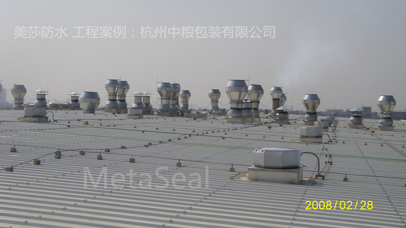 舉個工程案例,杭州中糧包裝有限公司,整個工廠鋼結構廠房有15萬平方米,屋面上有600多個煙囪管道,以及1000多個通風器,室內生產車間的溫度非常高,先前鋼結構公司曾應用過得泰蓋片,因漏水后續又補過很多次的硅膠,始終無法解決這些問題。后經設計院的專家推薦,使用了美莎金屬屋面防水體系,系統地進行防水維護施工,至今已有5年多時間,基本上沒有明顯的滲漏水問題。