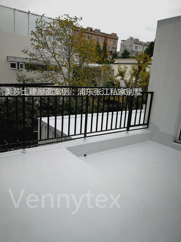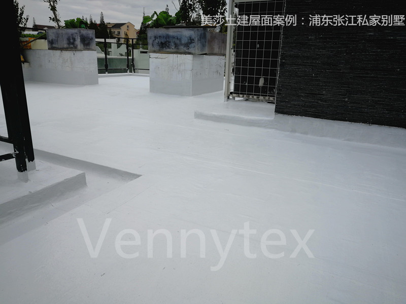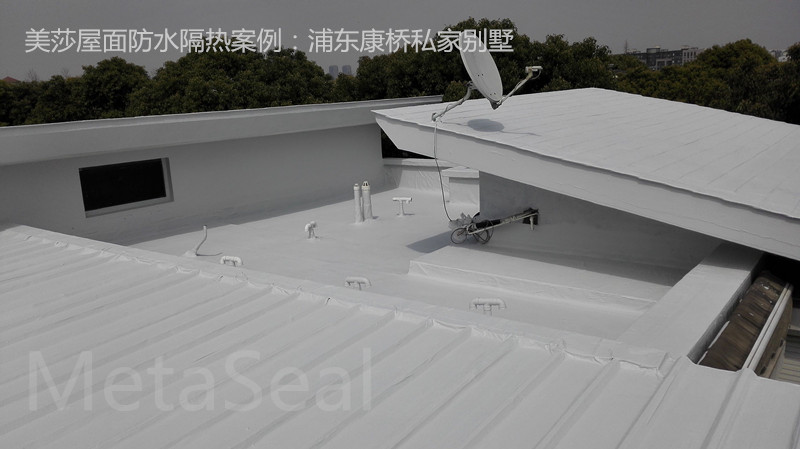 最后2張圖片是位于浦東新區張江高科技園區香楠路的東方日出苑別墅小區的兩戶業主屋面。原來采用的是SBS瀝青防水卷材,時常滲漏水,室內頂面墻面都已霉變。經采用美莎屋面防水隔熱涂料體系(含聚酯布)翻新后,整體煥然一新,一勞永逸地解決了屋面滲漏水的問題。