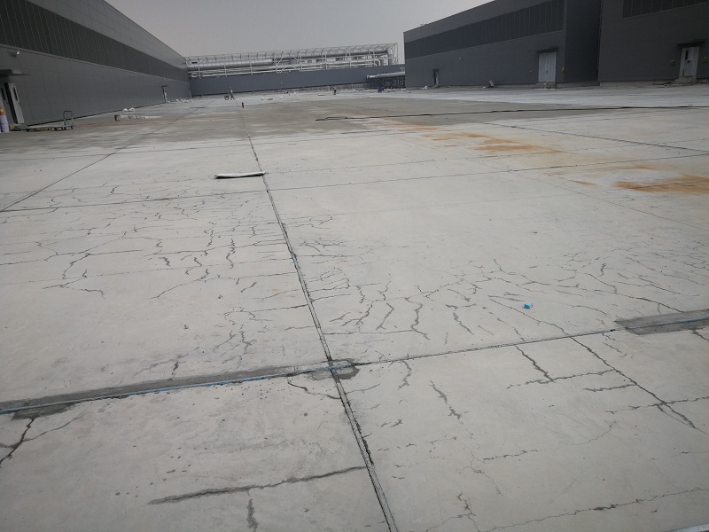 F1屋面共約30000平方米,原基面狀況較差(估計是冬季澆搗混凝土所致),裂縫及空鼓狀況較多。鑒于此項目要申報上海市白玉蘭獎項,所以必須要將屋面的基面加固,然后再整體噴涂美莎隔熱反光涂料,且要所有的分割線外露,填充灰色結構膠,施工難度很大。